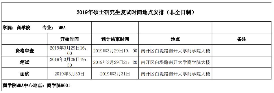 2019年南开大学MBA非全日制硕士研究生复试时间地点安排(非全日制)