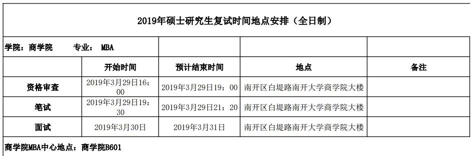 2019年南开大学MBA全日制硕士研究生复试时间地点安排(全日制)